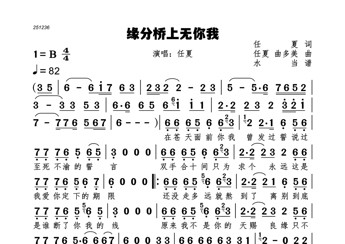 《缘分桥上无你我》是任夏演唱的一首歌曲,拍号为4/4拍,歌曲速度为每分钟82拍,这份简谱共有一张高清图谱,图谱由 @水当 编配上传。