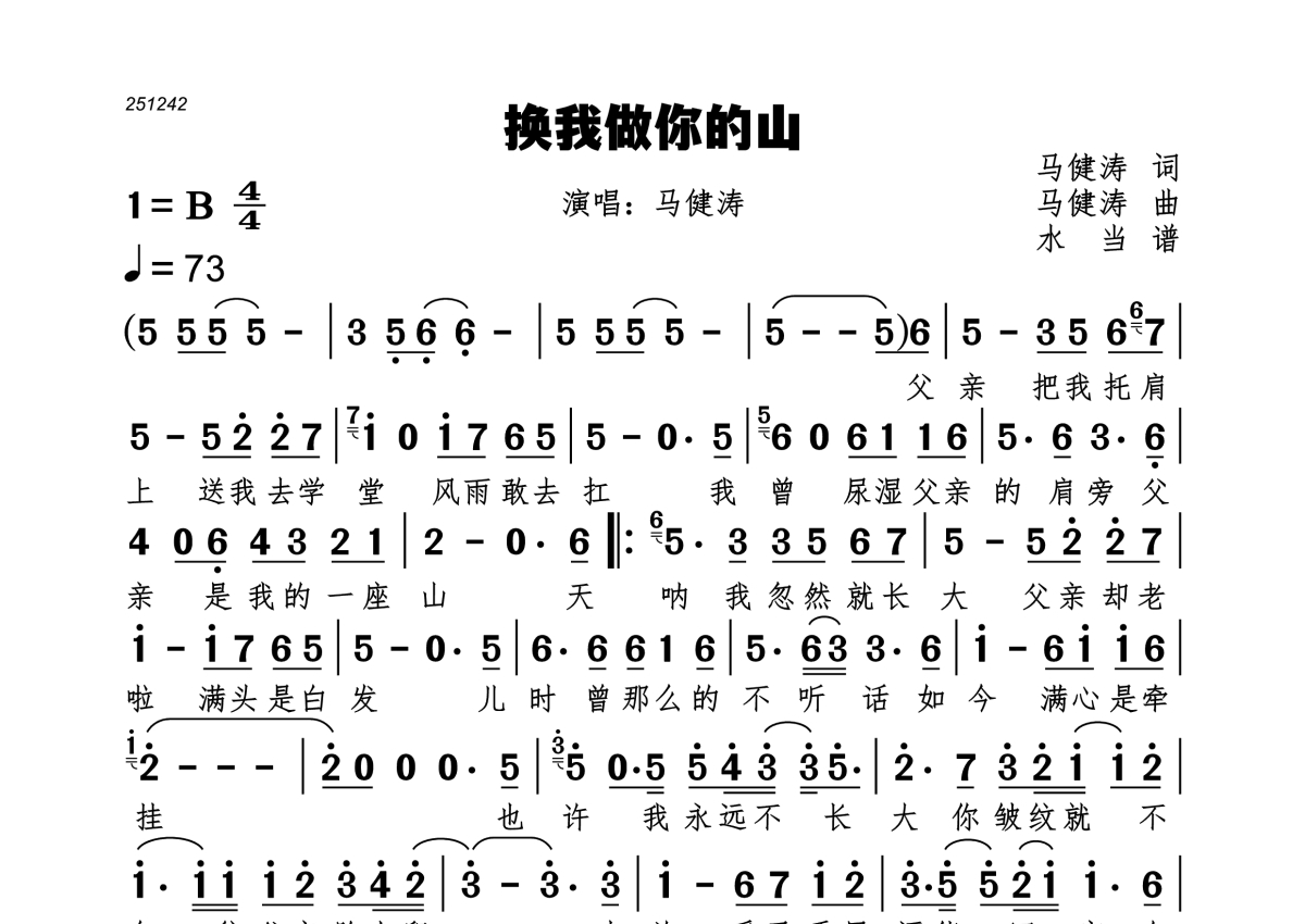 《换我做你的山》是马健涛演唱的一首歌曲,拍号为4/4拍,歌曲速度为每分钟73拍,这份简谱共有一张高清图谱,图谱由 @水当 编配上传。