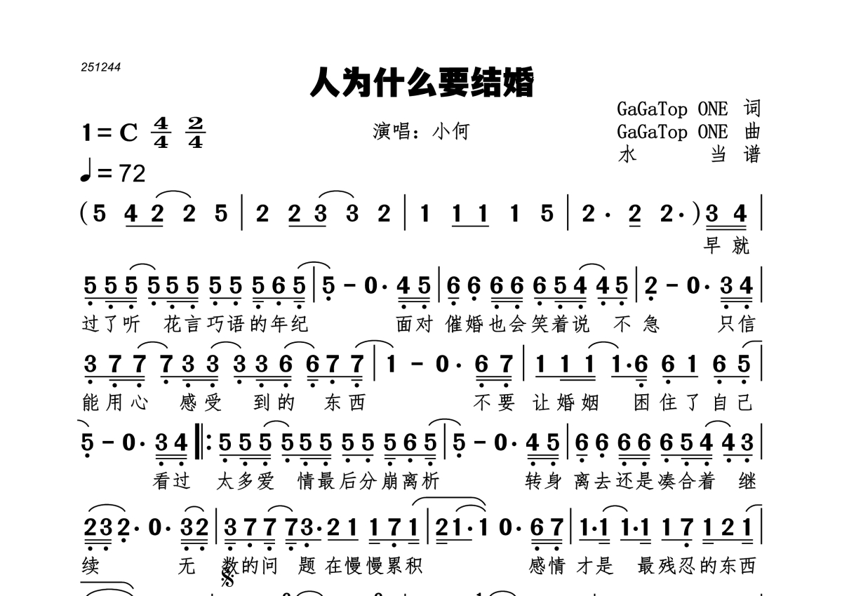 《人为什么要结婚》是小何演唱的一首歌曲,拍号为4/4拍,歌曲速度为每分钟72拍,这份简谱共有一张高清图谱,图谱由 @水当 编配上传。