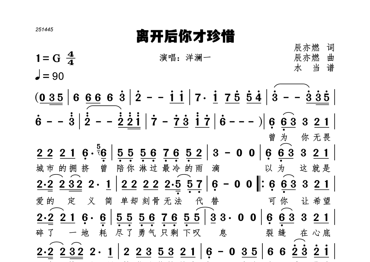 《离开后你才珍惜》是洋澜一演唱的一首歌曲,拍号为4/4拍,歌曲速度为每分钟90拍,这份简谱共有一张高清图谱,图谱由 @水当 编配上传。