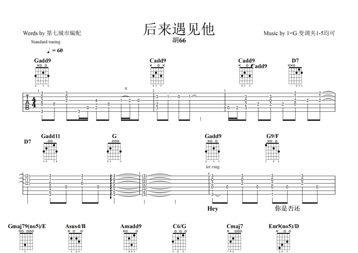 胡66《后来遇见他》吉他谱 - G调弹唱六线谱