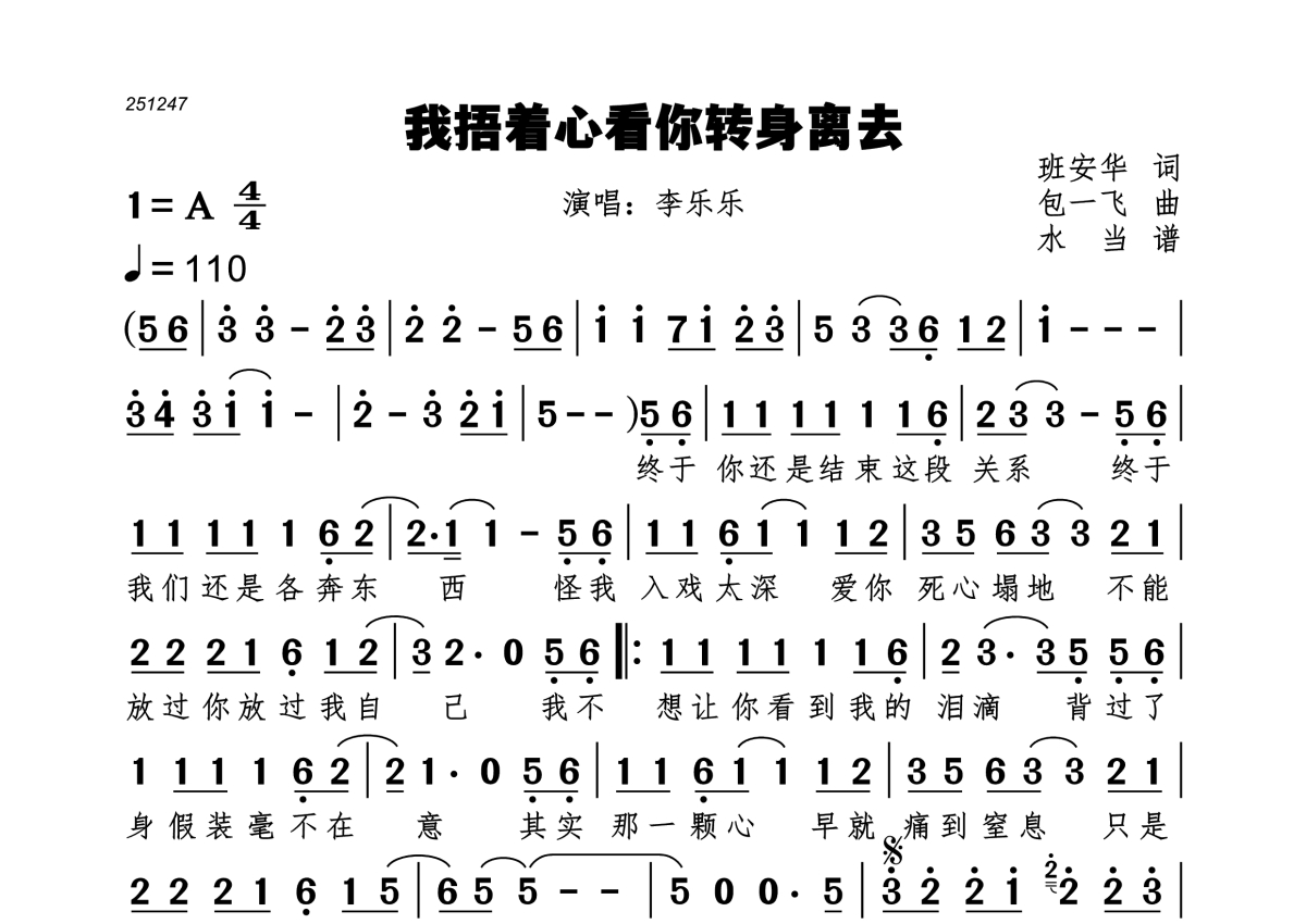 我捂着心看你转身离去简谱 - 李乐乐演唱
