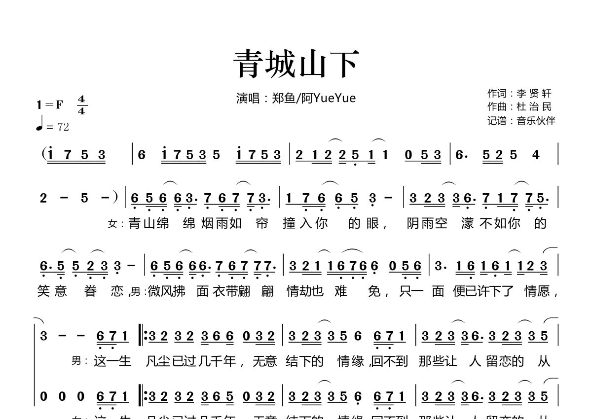 青城山下简谱 - 郑鱼\\u0026阿YueYue演唱