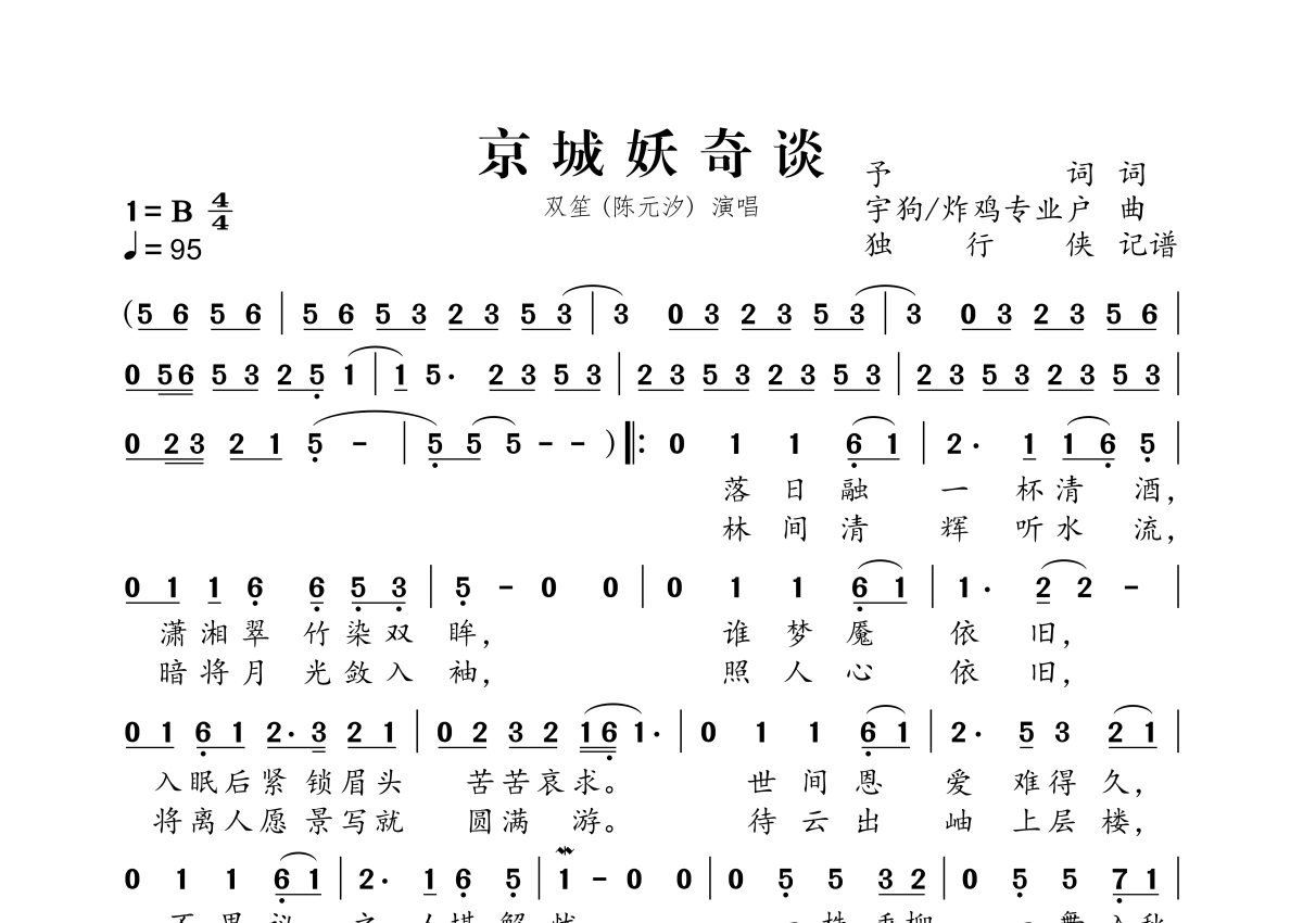 《京城妖奇谈》是双笙 (陈元汐)演唱的一首歌曲,拍号为4/4拍,歌曲速度为每分钟95拍,这份简谱共有一张高清图谱,图谱由 @独行侠 编配上传。
