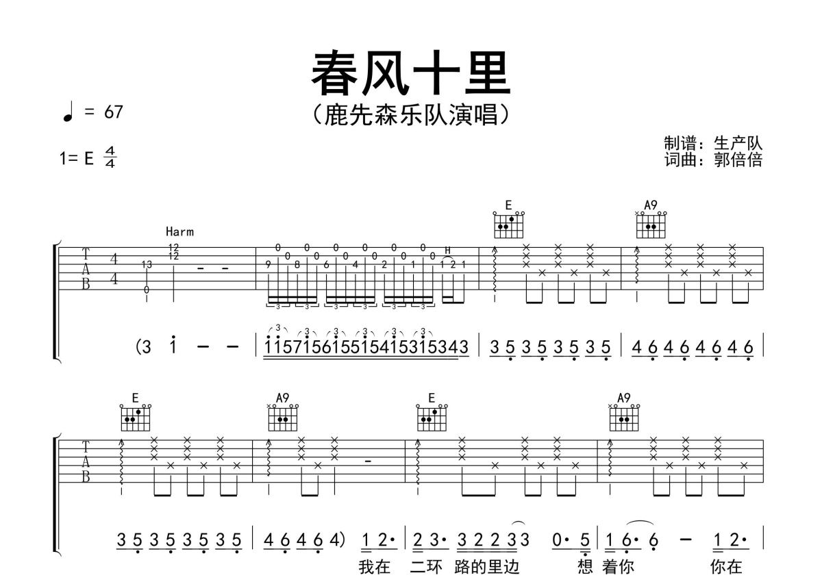 《春风十里》是鹿先森乐队演唱的一首歌曲,精编完美版,拍号为4/4拍,歌曲速度为每分钟67拍,歌曲原调为E调,但由于原调指法比较难,为了方便弹奏,本吉他谱采用的是E调指法编配,变调夹4品弹奏即为原调,当然也可以根据自己的音域改变变调夹位置,或者通过改变和弦调性,以方便自己弹奏,这份吉他谱共有三张高清图谱,图谱由 @生产队 编配上传,图谱使用六线谱编配,包含吉他和弦指法、简谱以及歌词部分,使用这份春风十里吉他谱,可以让你更加方便地掌握这首歌曲的弹唱技巧,快来尝试吧。鹿先森乐队演唱的民谣经典歌曲《春风十里》原版吉他谱,含前奏、间奏、尾奏solo编配,精编完美版,致敬经典!。