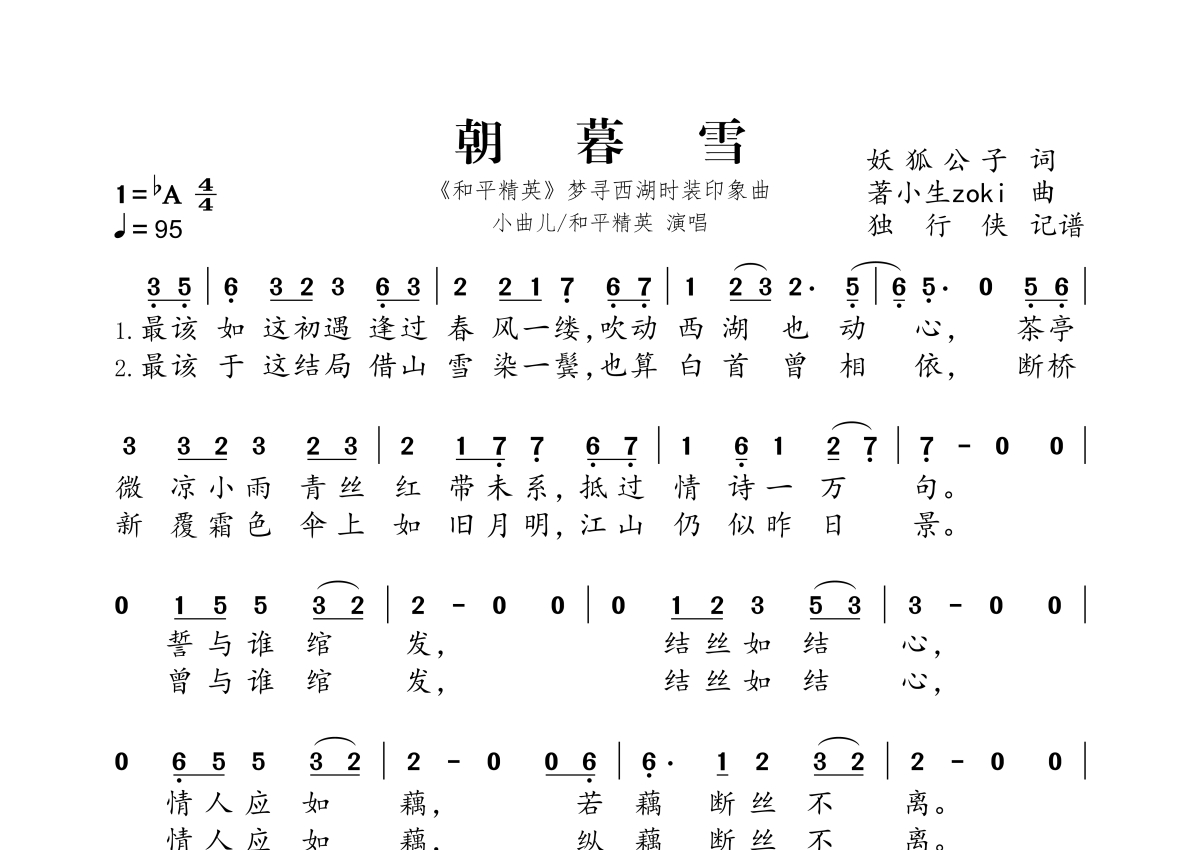 《朝暮雪》是小曲儿演唱的一首歌曲,拍号为4/4拍,歌曲速度为每分钟95拍,这份简谱共有一张高清图谱,图谱由 @独行侠 编配上传。