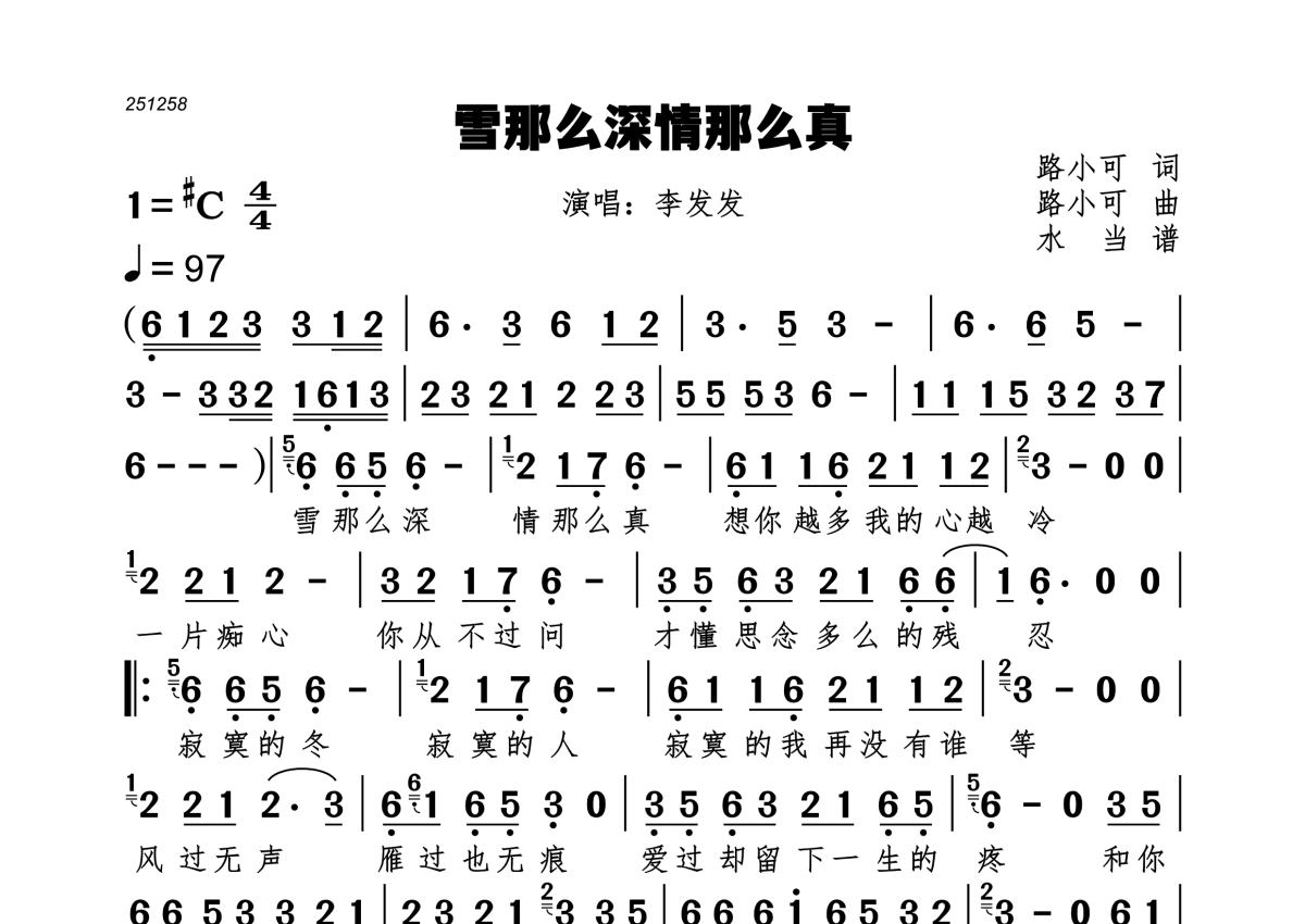《雪那么深情那么真》是李发发演唱的一首歌曲,拍号为4/4拍,歌曲速度为每分钟97拍,这份简谱共有一张高清图谱,图谱由 @水当 编配上传。