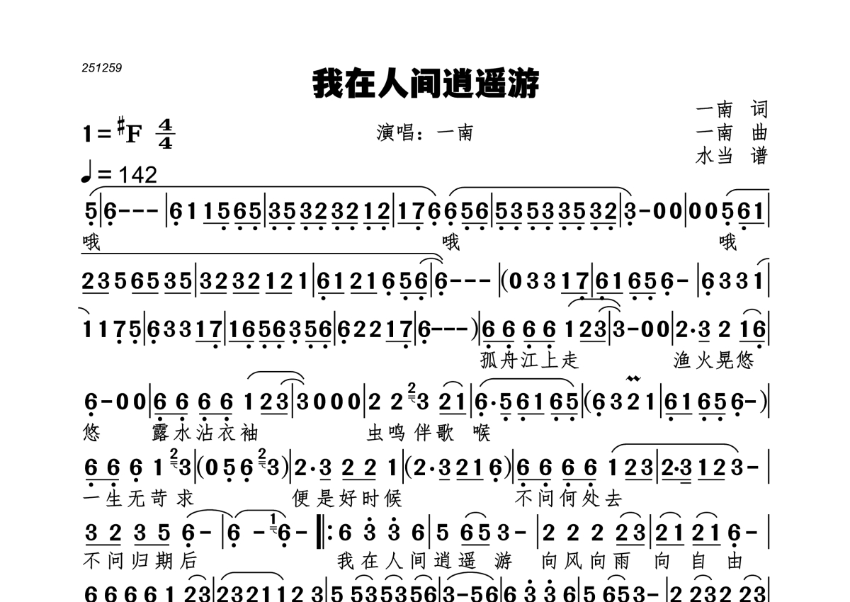 《我在人间逍遥游》是一南演唱的一首歌曲,拍号为4/4拍,歌曲速度为每分钟142拍,这份简谱共有一张高清图谱,图谱由 @水当 编配上传。