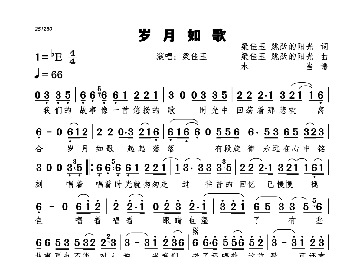 《岁月如歌》是梁佳玉演唱的一首歌曲,这份简谱共有一张高清图谱,图谱由 @水当 编配上传。