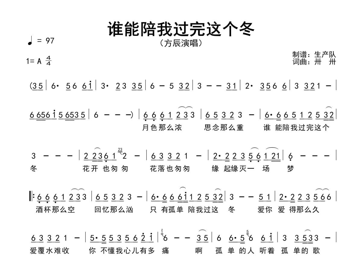 《谁能陪我过完这个冬》是方辰演唱的一首歌曲,原版简谱,拍号为4/4拍,歌曲速度为每分钟97拍,这份简谱共有一张高清图谱,图谱由 @生产队 编配上传方辰演唱的歌曲《谁能陪我过完这个冬》原版简谱,精准的前奏、间奏、尾奏solo编配,精编完美版,值得推荐!。