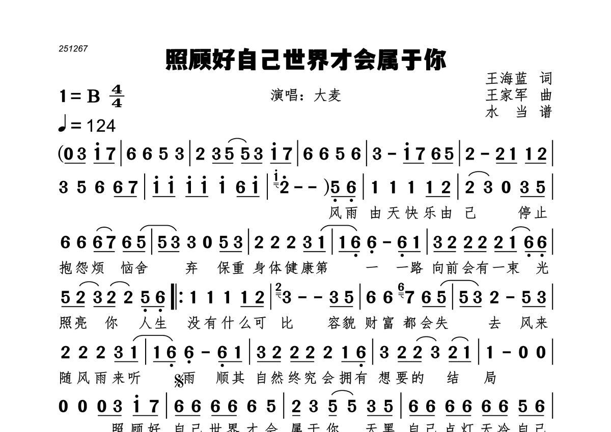 《照顾好自己世界才会属于你》是大麦演唱的一首歌曲,拍号为4/4拍,歌曲速度为每分钟124拍,这份简谱共有一张高清图谱,图谱由 @水当 编配上传。
