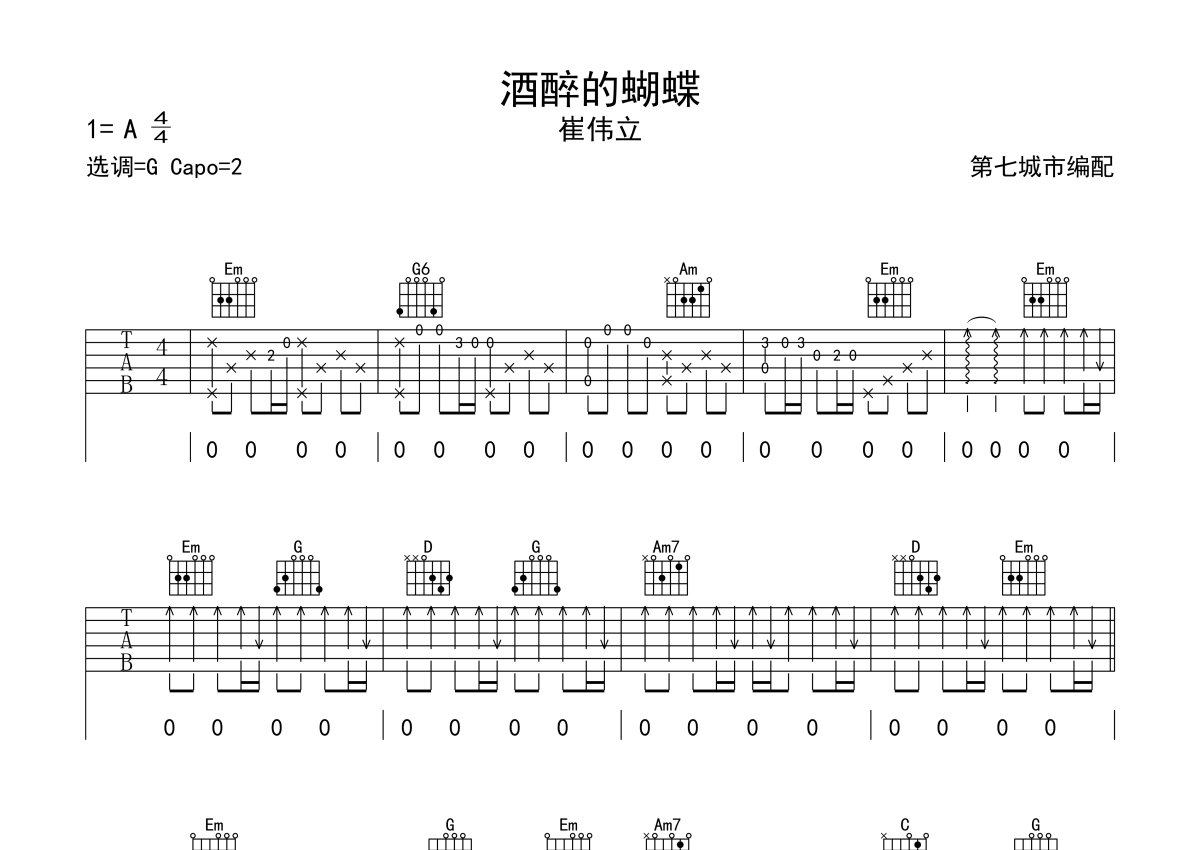 崔伟立《酒醉的蝴蝶》吉他谱 - G调弹唱六线谱