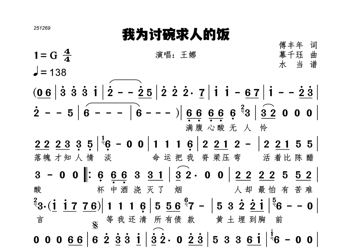 《我为讨碗求人的饭》是王娜演唱的一首歌曲,歌曲速度为每分钟138拍,这份简谱共有一张高清图谱,图谱由 @水当 编配上传。