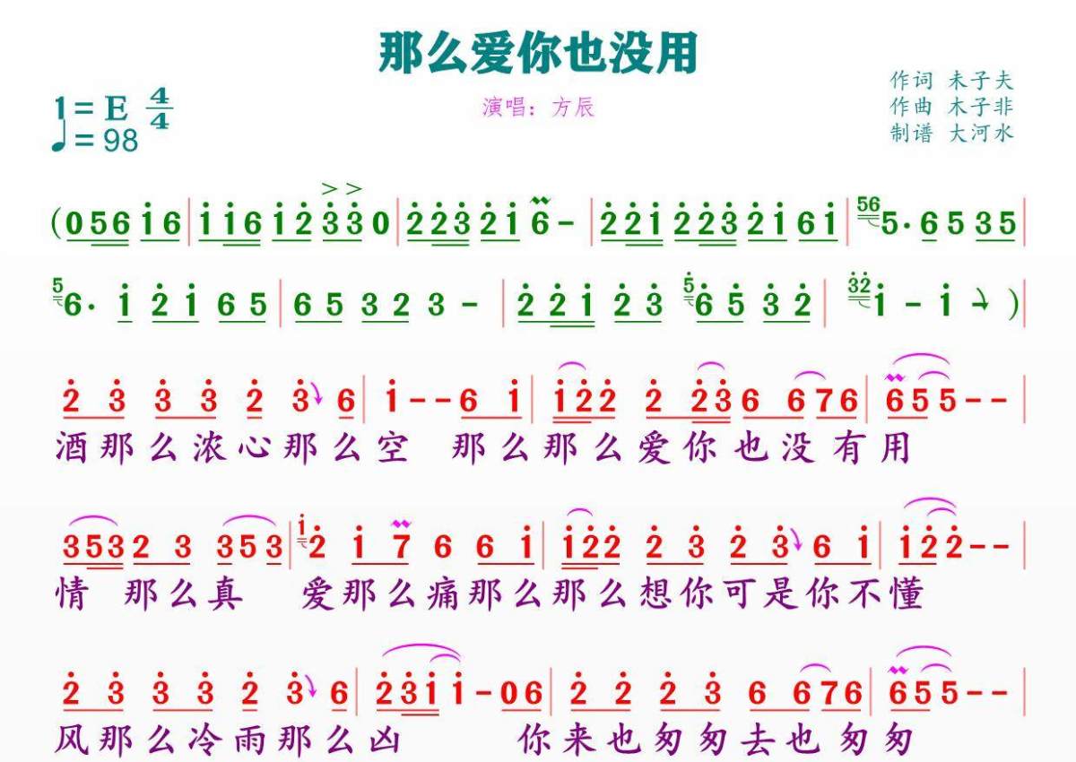 《那么爱你也没用》是方辰演唱的一首歌曲,拍号为4/4拍,这份简谱共有一张高清图谱,图谱由 @临海雪原 编配上传。