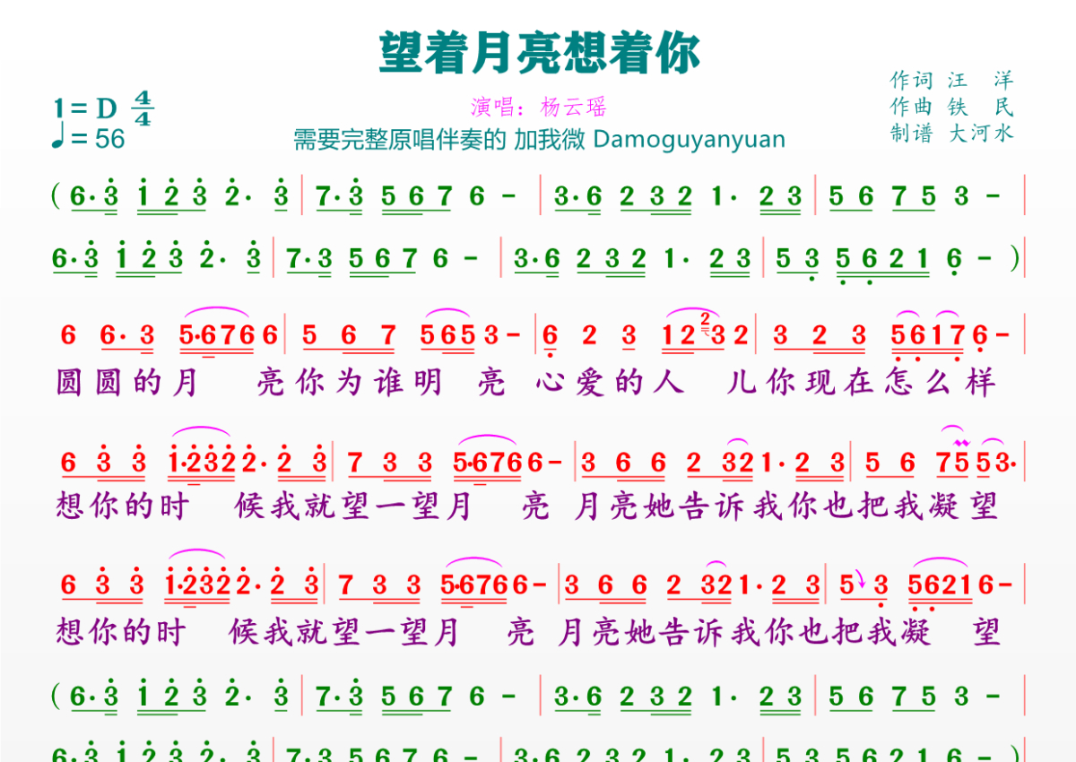 望着月亮想着你简谱 - 杨云瑶演唱