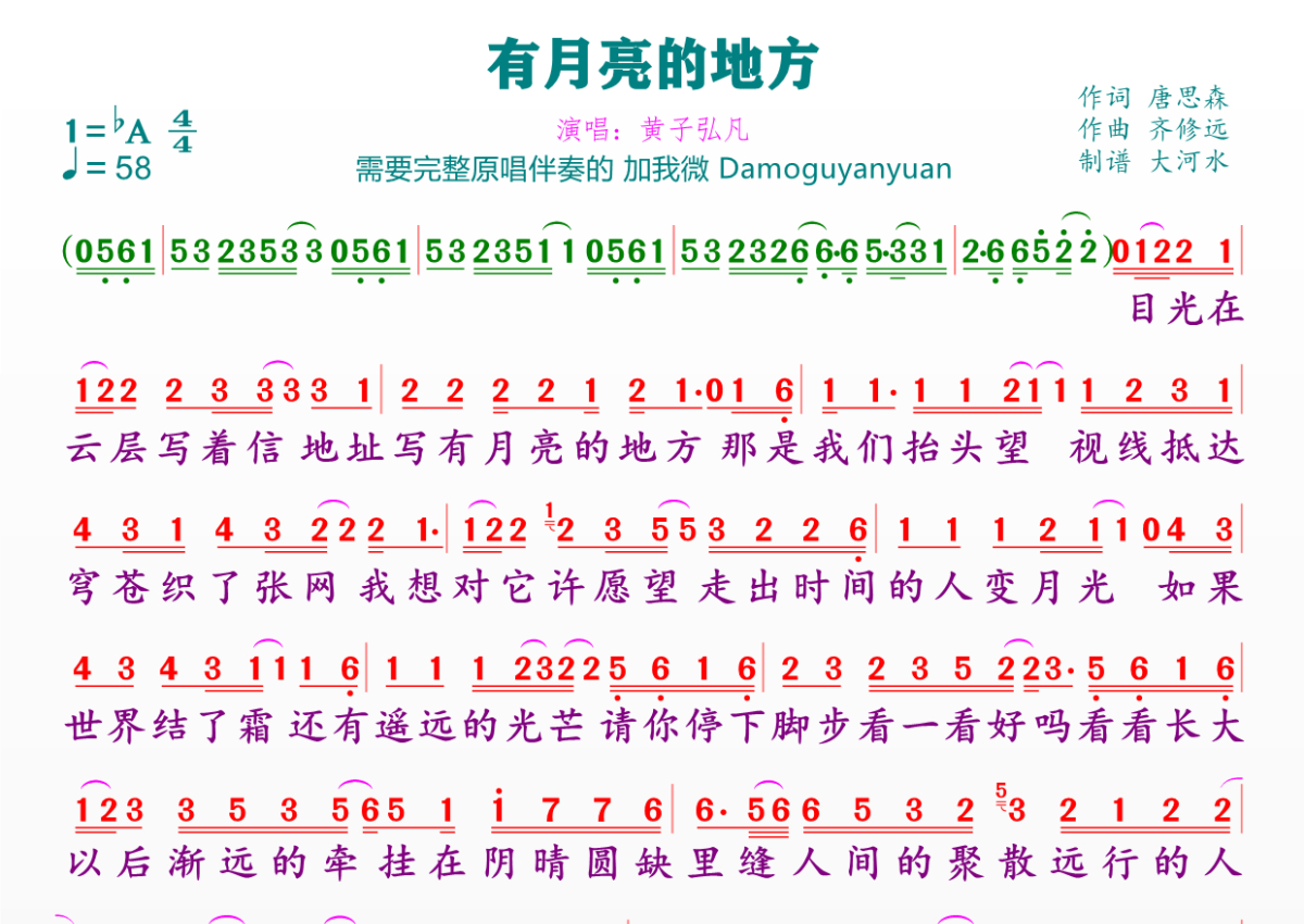 有月亮的地方简谱 - 黄子弘凡演唱