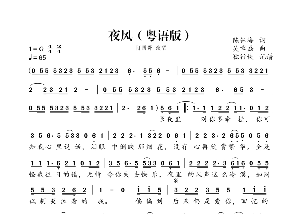 《夜风(粤语版)》是粤语版演唱的一首歌曲,拍号为4/4拍,歌曲速度为每分钟65拍,这份简谱共有一张高清图谱,图谱由 @独行侠 编配上传。