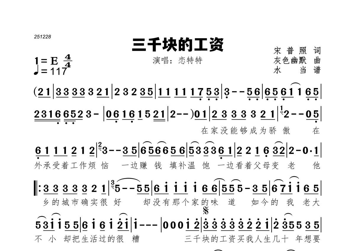 《三千块的工资》是恋特特演唱的一首歌曲,拍号为4/4拍,歌曲速度为每分钟117拍,这份简谱共有一张高清图谱,图谱由 @水当 编配上传。