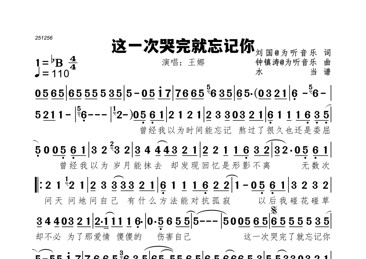 《这一次哭完就忘记你》是王娜演唱的一首歌曲,拍号为4/4拍,歌曲速度为每分钟110拍,这份简谱共有一张高清图谱,图谱由 @水当 编配上传。