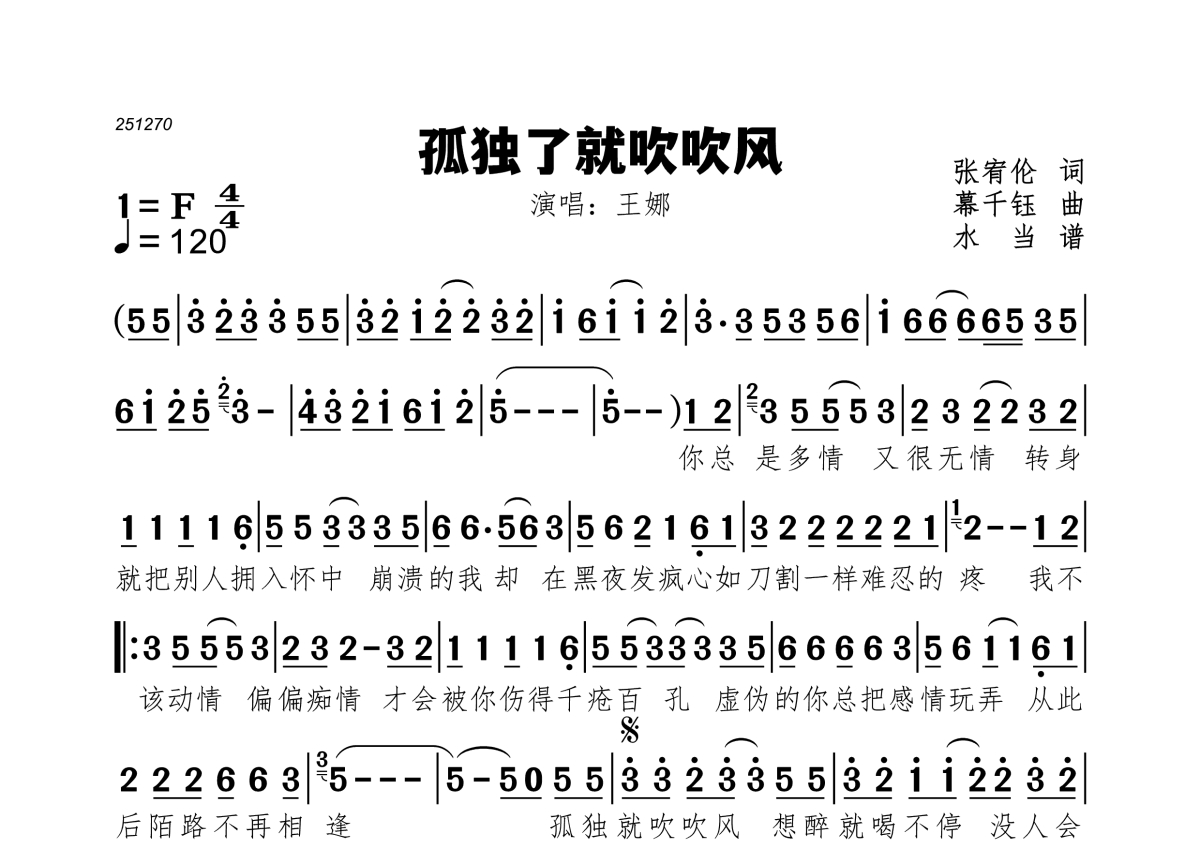 《孤独了就吹吹风》是王娜演唱的一首歌曲,拍号为4/4拍,歌曲速度为每分钟120拍,这份简谱共有一张高清图谱,图谱由 @水当 编配上传。