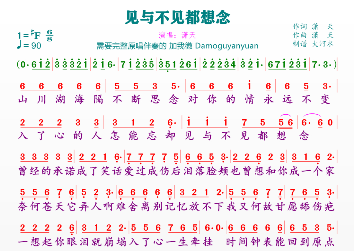 《见与不见都想念》是潇天演唱的一首歌曲,拍号为6/8拍,歌曲速度为每分钟90拍,这份简谱共有一张高清图谱,图谱由 @临海雪原 编配上传。