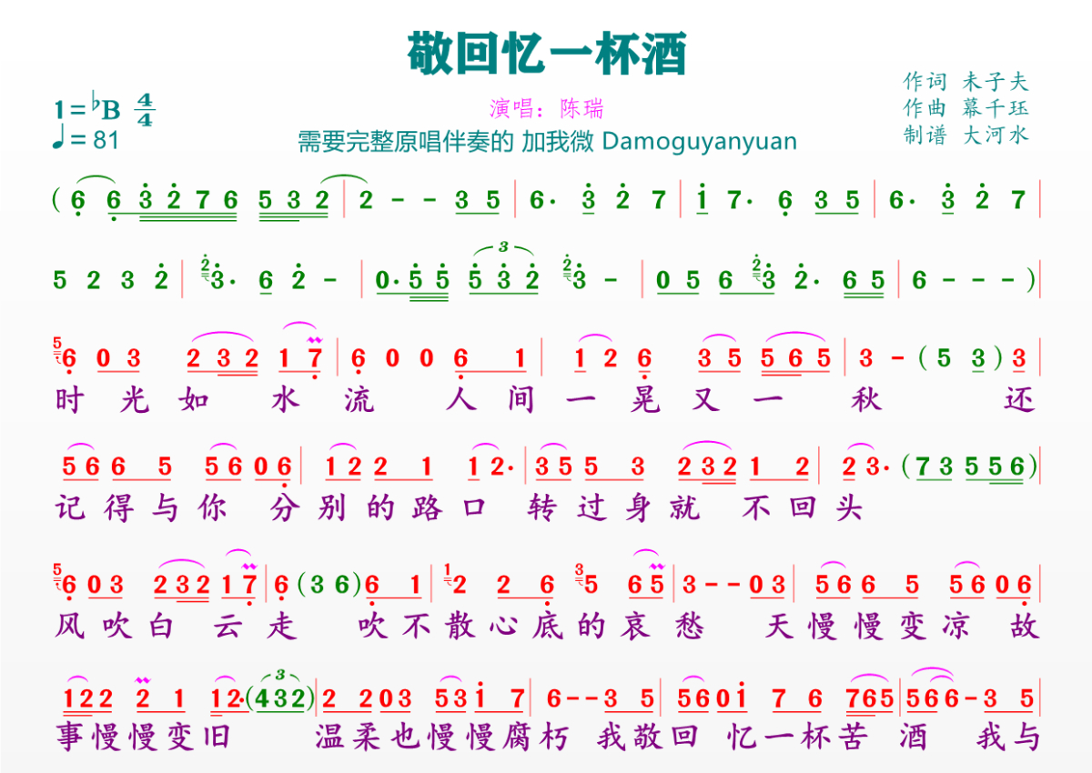 《敬回忆一杯酒》是陈瑞演唱的一首歌曲,拍号为4/4拍,歌曲速度为每分钟81拍,这份简谱共有一张高清图谱,图谱由 @临海雪原 编配上传。