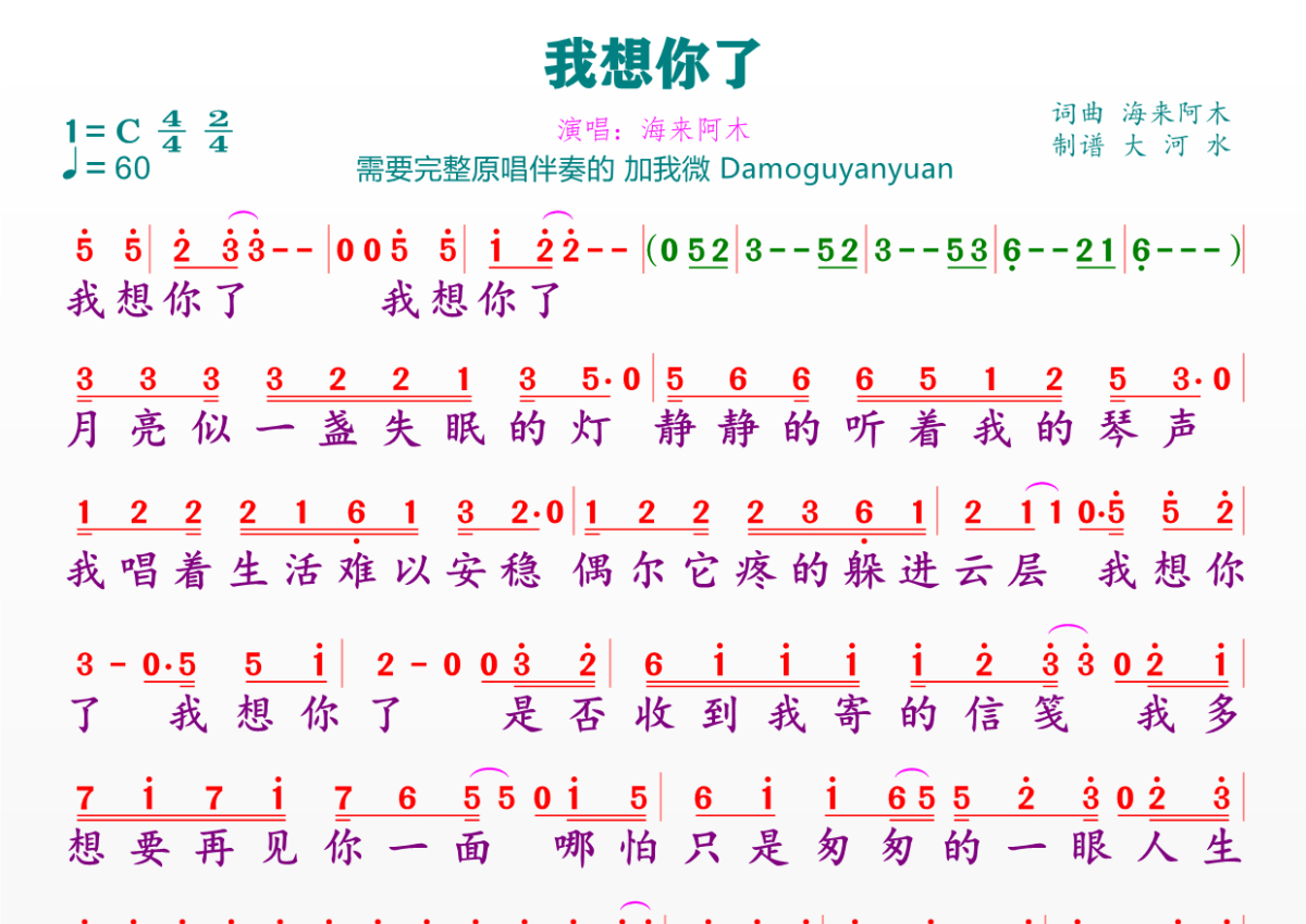 《我想你了》是海来阿木演唱的一首歌曲,拍号为4/4拍,歌曲速度为每分钟60拍,这份简谱共有一张高清图谱,图谱由 @临海雪原 编配上传。