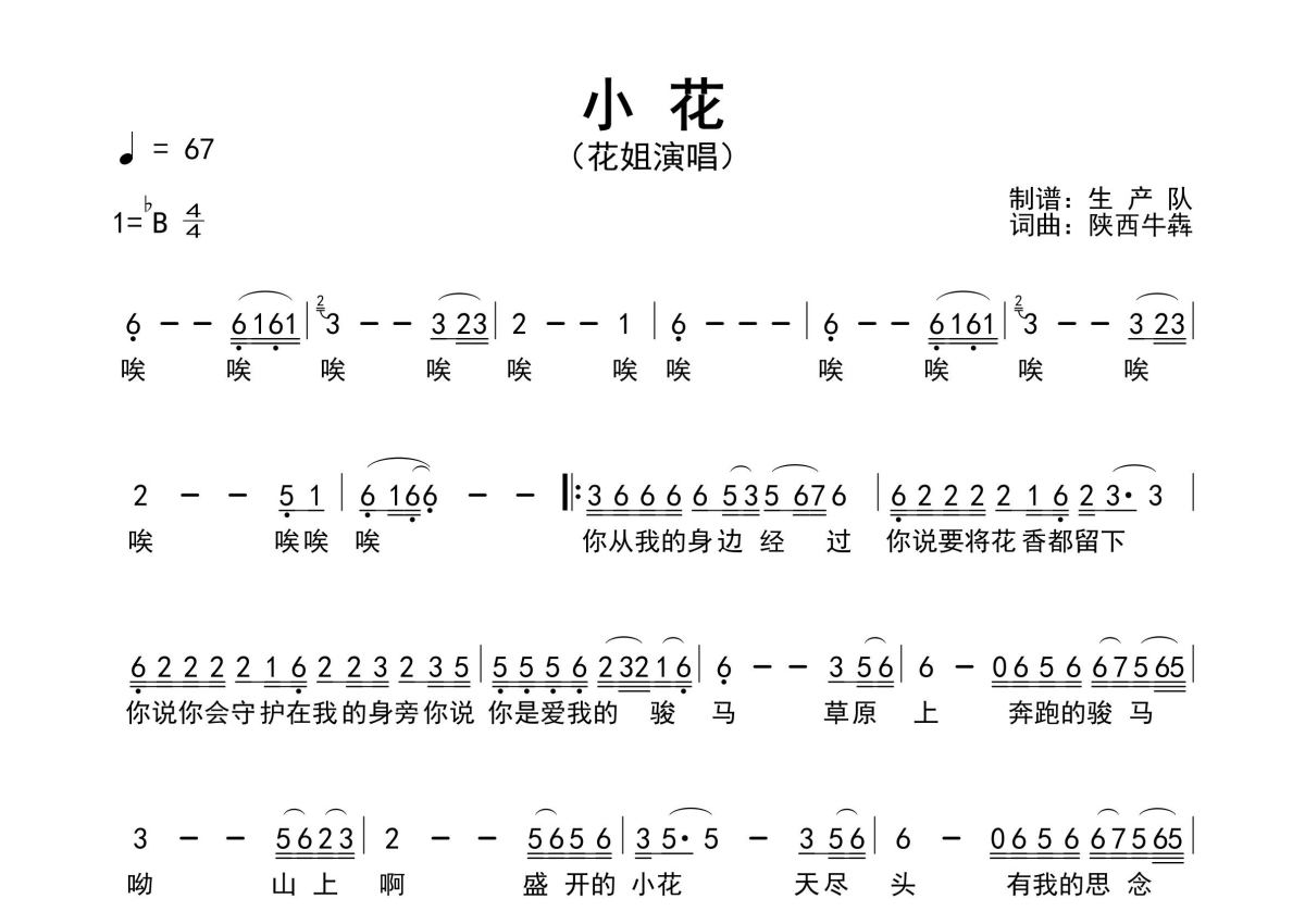 《小花》是花姐演唱的一首歌曲,原版简谱,拍号为4/4拍,歌曲速度为每分钟67拍,这份简谱共有一张高清图谱,图谱由 @生产队 编配上传花姐演唱的歌曲《小花》原版简谱,完整的前奏、尾奏solo编配,精编完美版,优质推荐!。