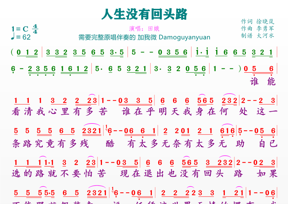 《人生没有回头路》是田娥演唱的一首歌曲,拍号为4/4拍,歌曲速度为每分钟62拍,这份简谱共有一张高清图谱,图谱由 @临海雪原 编配上传。
