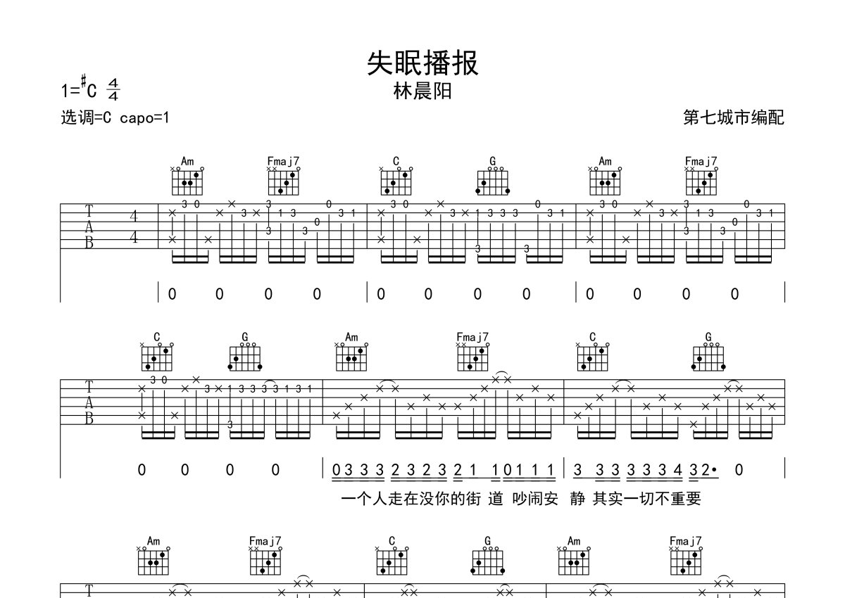 林晨阳《失眠播报》吉他谱 - C调弹唱六线谱