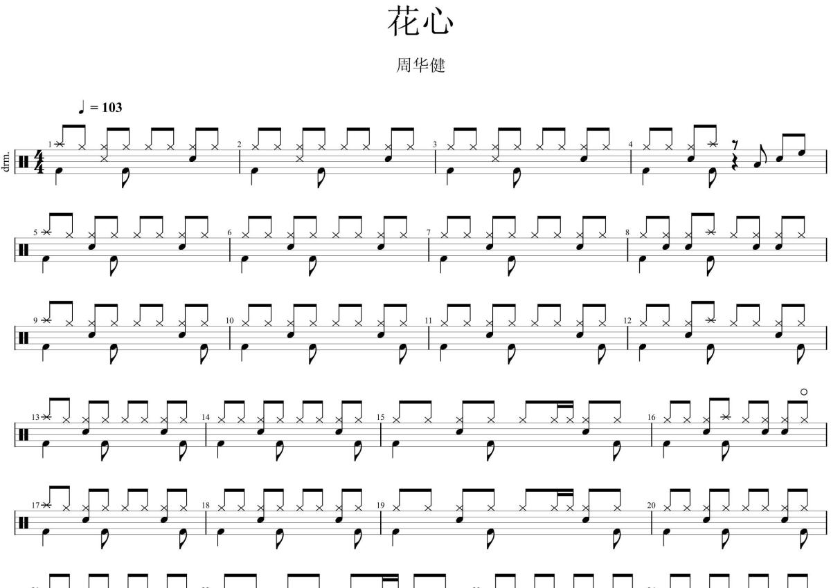 《花心》是周华健演唱的一首歌曲,这份架子鼓谱共有两张高清图谱,图谱由 @鼓动飞扬 编配上传,图谱使用五线谱编配,使用这份花心架子鼓谱,你将能够轻松地敲打出这首周华健的花心,快来尝试吧。