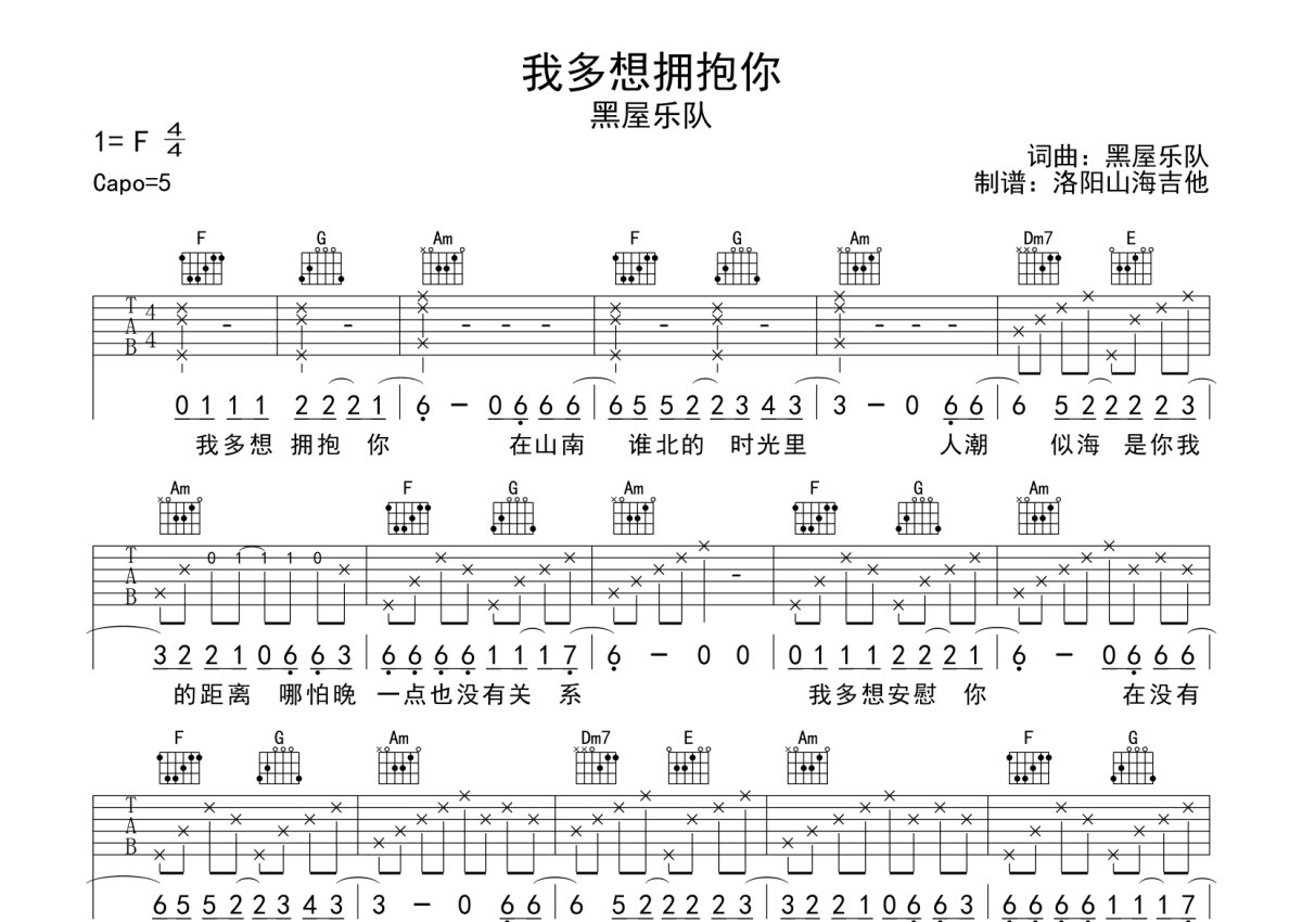 黑屋 乐队《我多想拥抱你》吉他谱 - G调弹唱六线谱