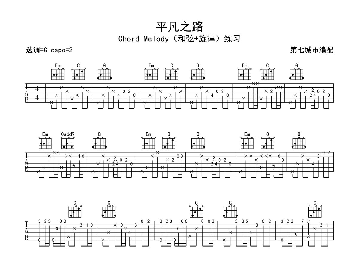 朴树《平凡之路》吉他谱 - 独奏六线谱 - 和弦+旋律 练习