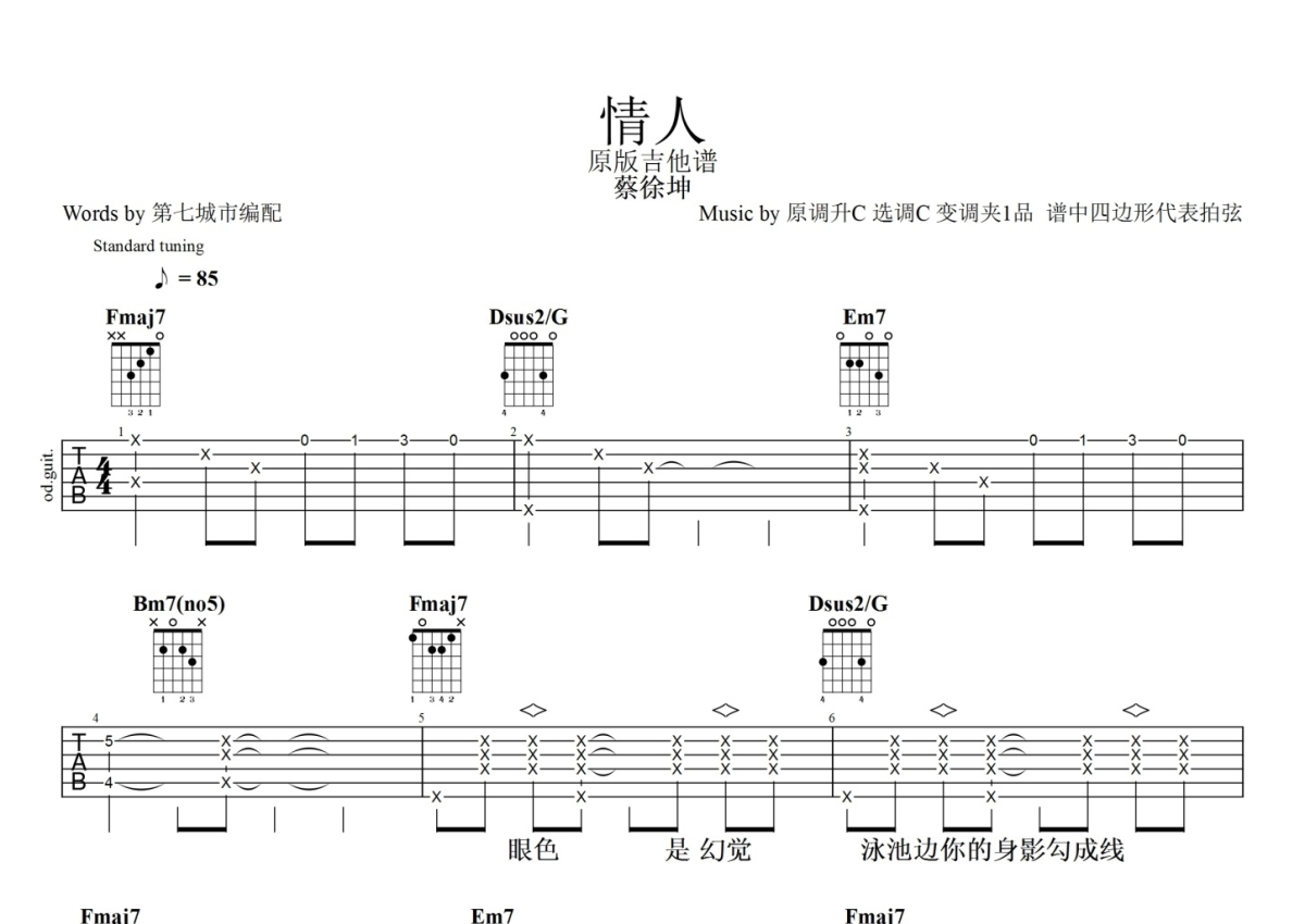 《情人》是蔡徐坤演唱的一首歌曲,这份吉他谱共有四张高清图谱,图谱由 @第七城市 编配上传,图谱使用六线谱编配,包含吉他和弦指法、简谱以及歌词部分,使用这份情人吉他谱,可以让你更加方便地掌握这首歌曲的弹唱技巧,快来尝试吧。本曲谱由第七城市编配制作。