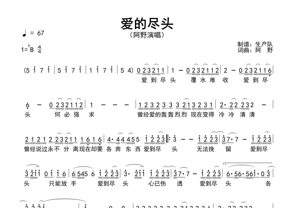 《爱的尽头》是阿野演唱的一首歌曲,原版简谱,拍号为4/4拍,歌曲速度为每分钟67拍,这份简谱共有一张高清图谱,图谱由 @生产队 编配上传阿野作词、作曲并演唱的歌曲《爱的尽头》原版简谱,精编完美版,优质推荐!。