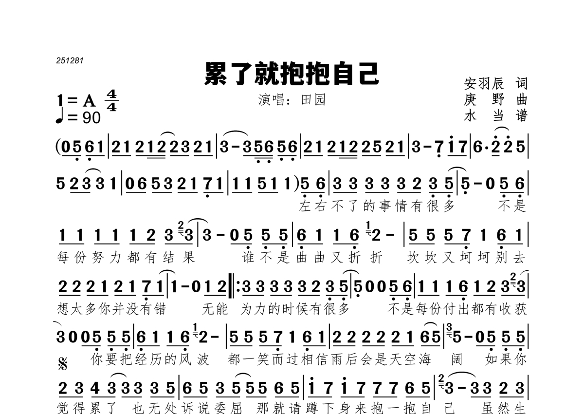 《累了就抱抱自己》是田园演唱的一首歌曲,拍号为4/4拍,歌曲速度为每分钟90拍,这份简谱共有一张高清图谱,图谱由 @水当 编配上传。