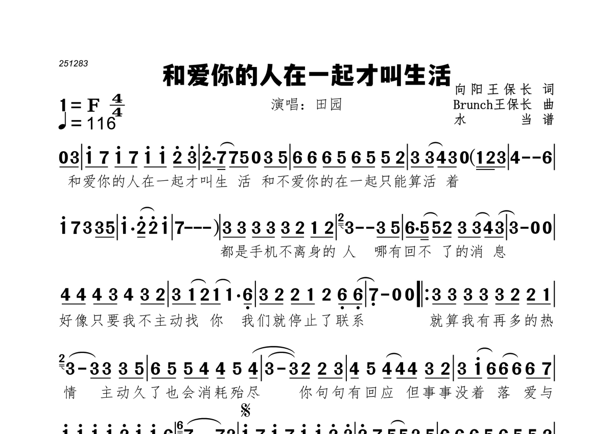 《和爱你的人在一起才叫生活》是田园演唱的一首歌曲,拍号为4/4拍,歌曲速度为每分钟116拍,这份简谱共有一张高清图谱,图谱由 @水当 编配上传。