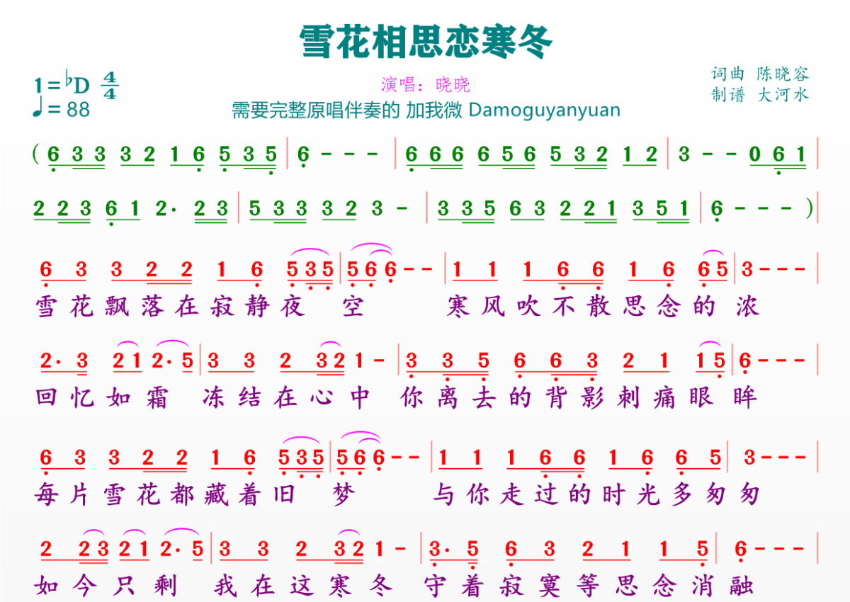 雪花相思恋寒冬简谱 - 晓晓演唱