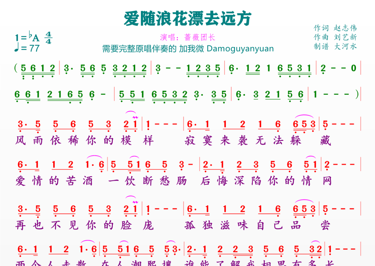 《爱随浪花飘去远方》是蔷薇团长演唱的一首歌曲,拍号为4/4拍,歌曲速度为每分钟77拍,这份简谱共有一张高清图谱,图谱由 @临海雪原 编配上传。