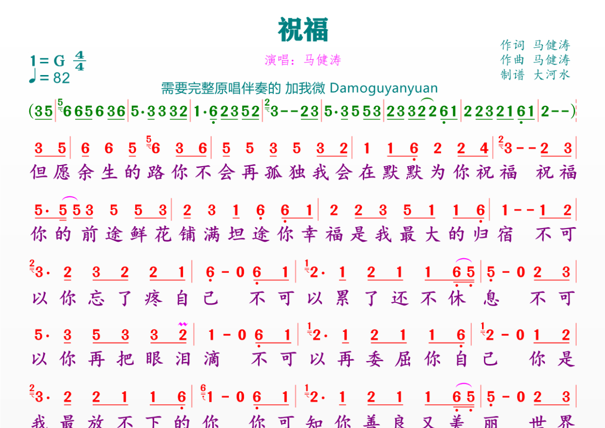 《祝福》是马健涛演唱的一首歌曲,拍号为4/4拍,歌曲速度为每分钟82拍,这份简谱共有一张高清图谱,图谱由 @临海雪原 编配上传。