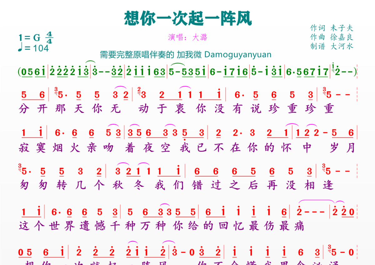 《想你一次起一阵风》是大潞演唱的一首歌曲,拍号为4/4拍,歌曲速度为每分钟104拍,这份简谱共有一张高清图谱,图谱由 @临海雪原 编配上传。