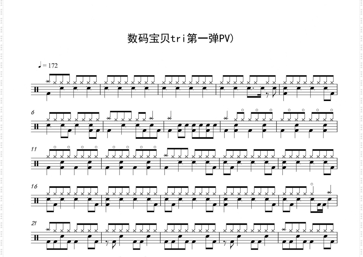 《数码宝贝tri》是第一弹PV演唱的一首歌曲,拍号为4/4拍,歌曲速度为每分钟172拍,这份架子鼓谱共有两张高清图谱,图谱由 @音符喷血者 编配上传,图谱使用五线谱编配,使用这份数码宝贝tri架子鼓谱,你将能够轻松地敲打出这首第一弹PV的数码宝贝tri,快来尝试吧。