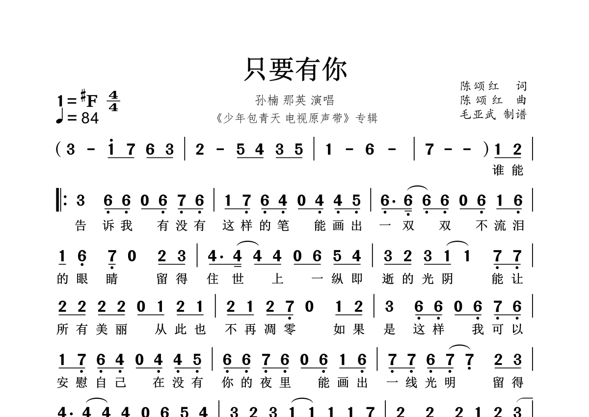 《只要有你》是孙楠/那英演唱的一首歌曲,这份简谱共有两张高清图谱,图谱由 @秋天的童话 编配上传。