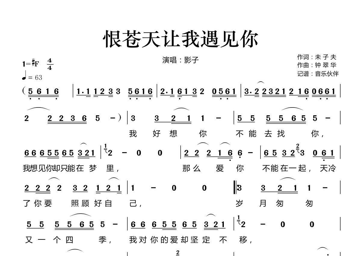 《恨苍天让我遇见你》是影子演唱的一首歌曲,拍号为4/4拍,歌曲速度为每分钟63拍,这份简谱共有一张高清图谱,图谱由 @音乐伙伴 编配上传。