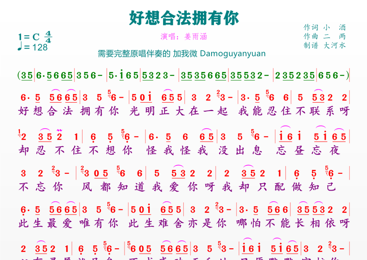 《好想合法拥有你》是姜雨涵演唱的一首歌曲,拍号为4/4拍,歌曲速度为每分钟128拍,这份简谱共有一张高清图谱,图谱由 @临海雪原 编配上传。