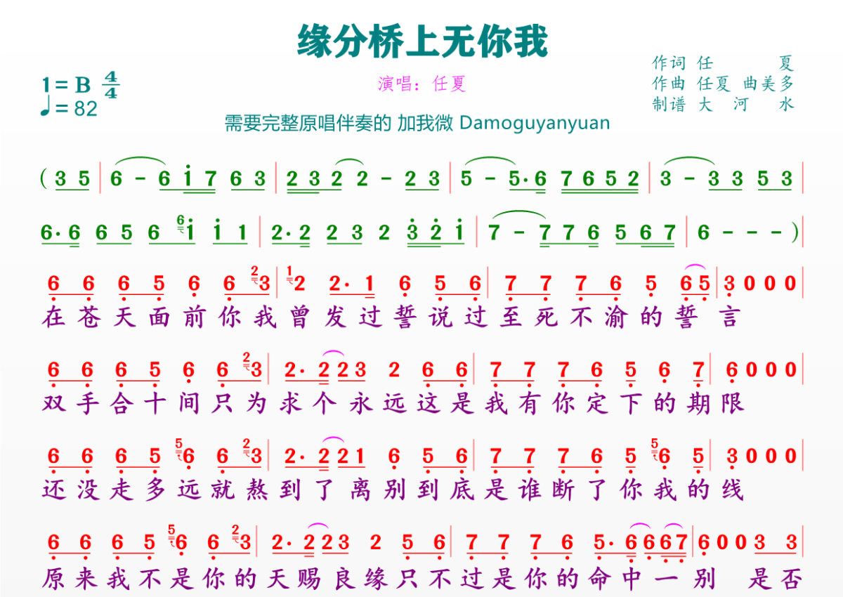 《缘分桥上无你我》是任夏演唱的一首歌曲,拍号为4/4拍,歌曲速度为每分钟82拍,这份简谱共有一张高清图谱,图谱由 @临海雪原 编配上传。