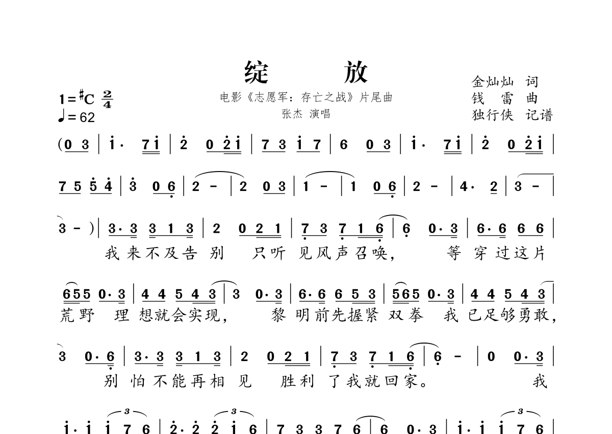 《绽放(电影《志愿军:存亡之战》片尾曲)》是电影《志愿军:存亡之战》片尾曲演唱的一首歌曲,拍号为2/4拍,歌曲速度为每分钟62拍,这份简谱共有两张高清图谱,图谱由 @独行侠 编配上传。