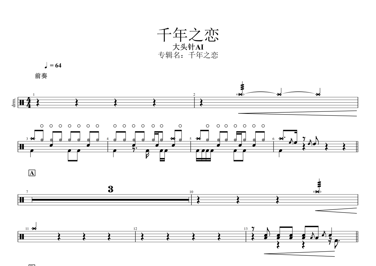 《千年之恋》是大头针Al演唱的一首歌曲,这份架子鼓谱共有两张高清图谱,图谱由 @小东鼓谱 编配上传,图谱使用五线谱编配,使用这份千年之恋架子鼓谱,你将能够轻松地敲打出这首大头针Al的千年之恋,快来尝试吧。