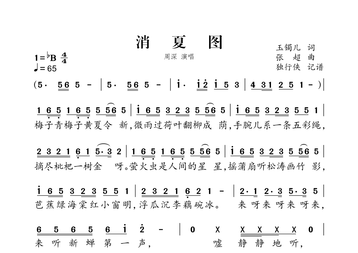 《消夏图》是周深演唱的一首歌曲,拍号为4/4拍,歌曲速度为每分钟65拍,这份简谱共有两张高清图谱,图谱由 @独行侠 编配上传。
