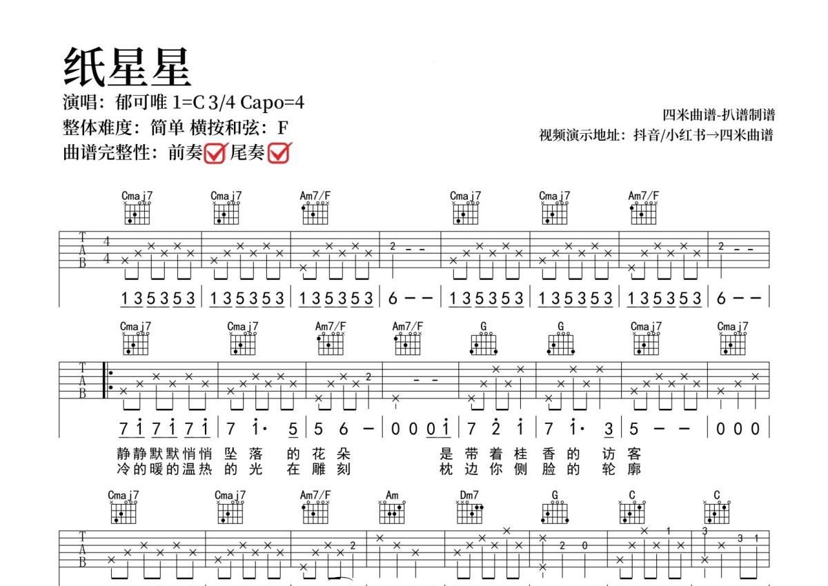 《纸星星》是郁可唯演唱的一首歌曲,拍号为4/4拍,歌曲原调为E调,但由于原调指法比较难,为了方便弹奏,本吉他谱采用的是E调指法编配,变调夹4品弹奏即为原调,当然也可以根据自己的音域改变变调夹位置,或者通过改变和弦调性,以方便自己弹奏,这份吉他谱共有两张高清图谱,图谱由 @SRV7758521 编配上传,图谱使用六线谱编配,包含吉他和弦指法、简谱以及歌词部分,使用这份纸星星吉他谱,可以让你更加方便地掌握这首歌曲的弹唱技巧,快来尝试吧。
